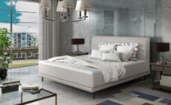 La forme simple du lit contraste bien avec une tête de lit haute, rembourrée de mousse T21 et finie avec des coutures intelligentes qui imitent les lignes horizontales du capitonnage.