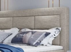 C’est un lit boxspring, caractérisé par un matelas haut, un grand cadre rembourré, une tête de lit haute et un matelas extrêmement doux.