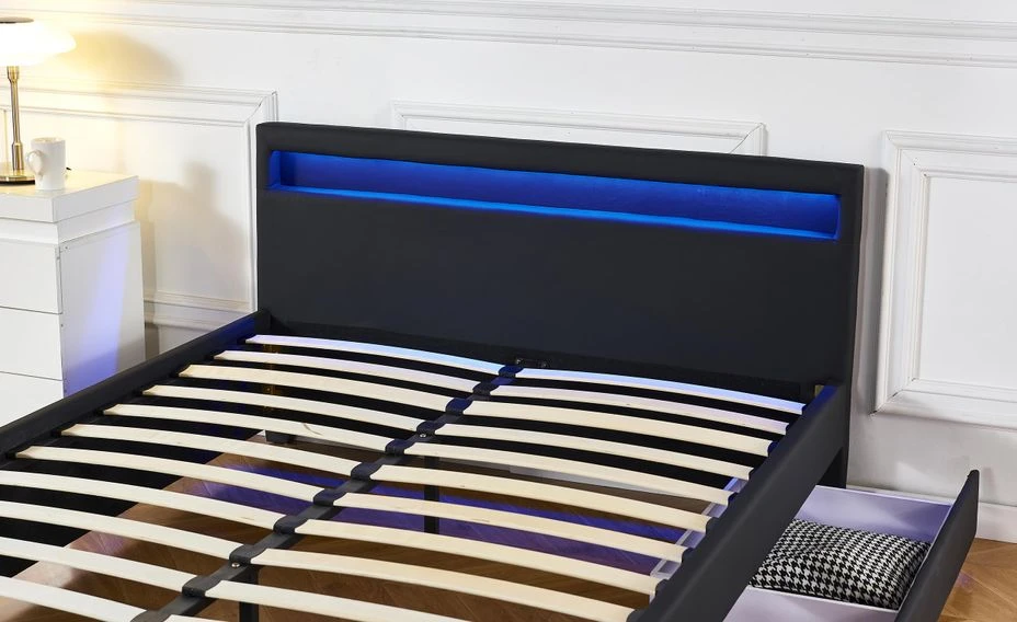 Sous son sommier relevable se situe un large coffre et 2 tiroirs sur le côtés vous offrent un bel espace de rangement pour vos oreillers, draps et couettes. Un éclairage LED est intégré à la tête de lit