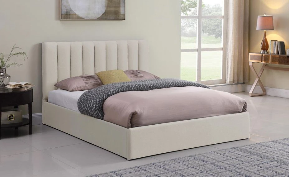 La tête de lit est rembourrée pour un confort maximal. L’espace de rangement situé sous le sommier est accessible facilement en soulevant celui-ci (ouverture aidée par pistons).