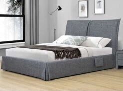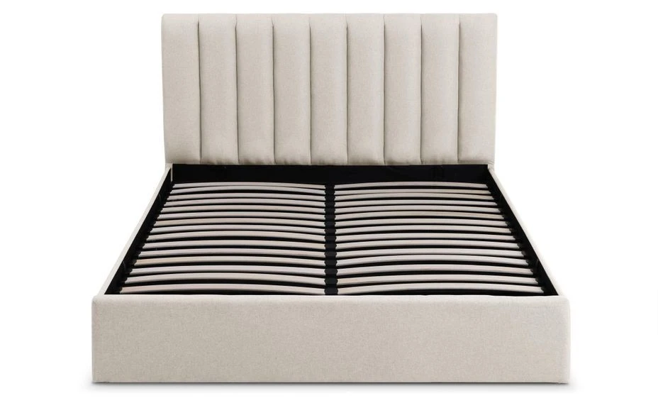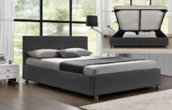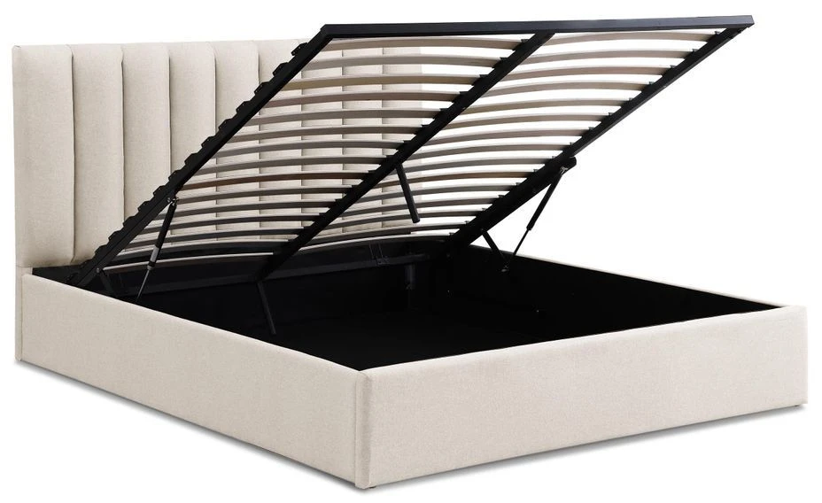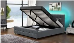 La tête de lit est rembourrée pour un confort maximal. L’espace de rangement situé sous le sommier est accessible facilement en soulevant celui-ci (ouverture aidée par pistons).