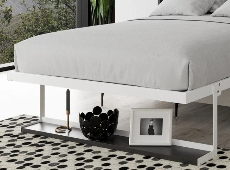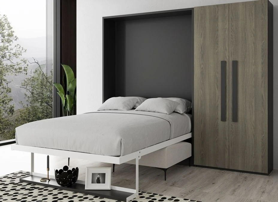 Son système de sécurité optimal et exclusif confère au meuble un mécanisme de verrouillage en position lit. À son tour en position surélevée, le lit est complètement caché à l’intérieur du meuble, donnant l’apparence d’un placard fermé.